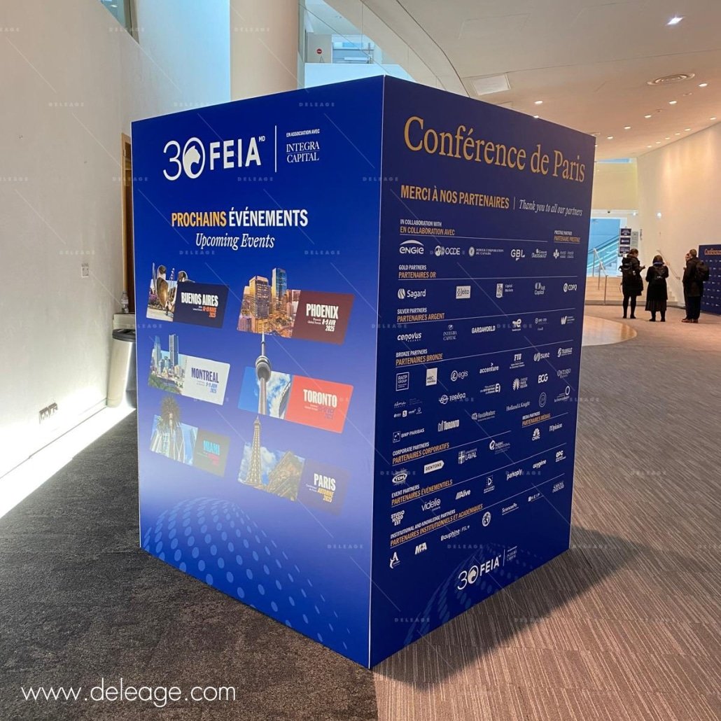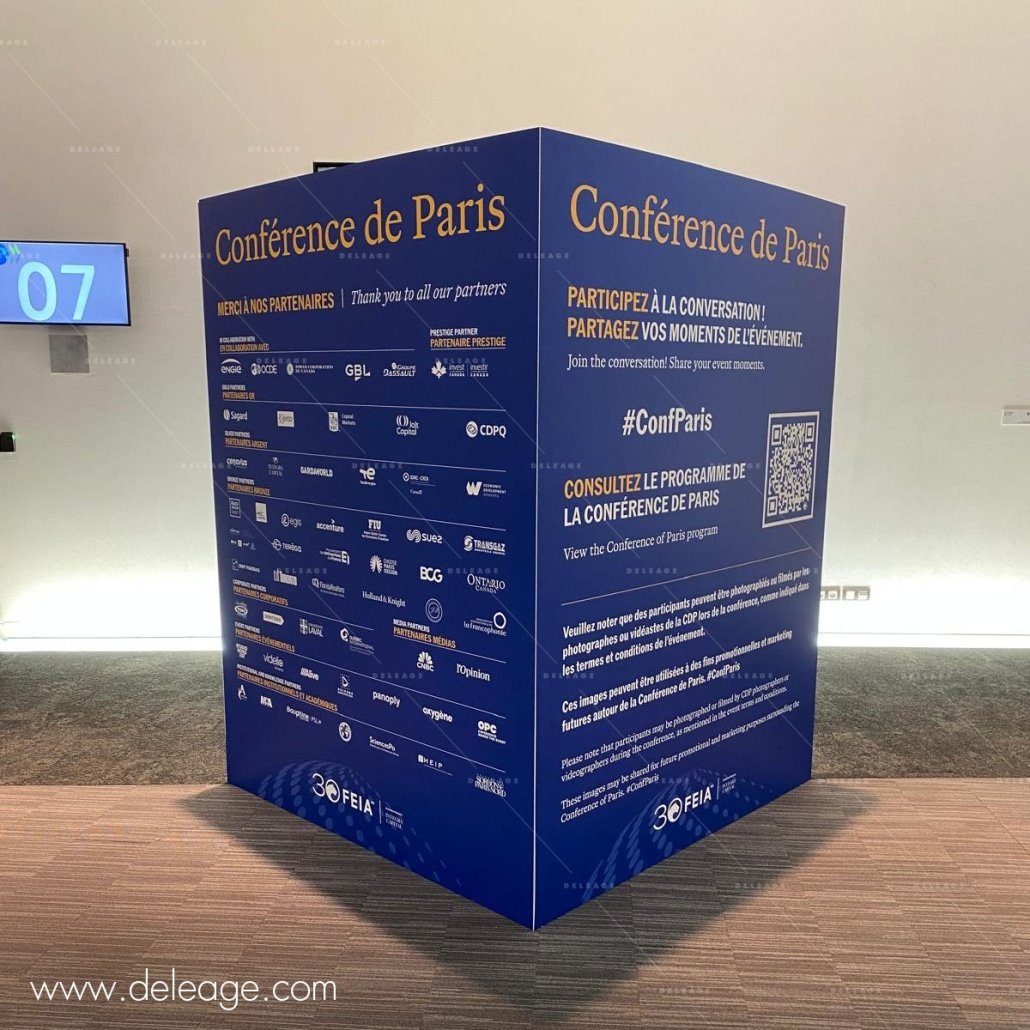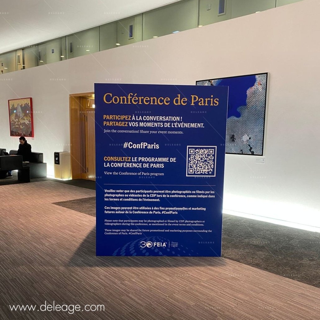 Depuis plusieurs années, DELEAGE est le partenaire privilégié pour la signalétique et les installations de la Conférence de Paris. Son expertise et sa créativité ont permis de transformer cet événement en une expérience mémorable. Pour l’année 2024, DELEAGE a réitéré son engagement en proposant des idées novatrices pour la décoration et l’aménagement des espaces.