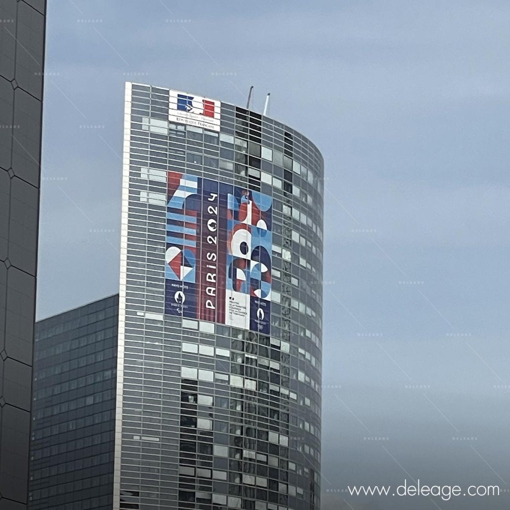 Habillage aux couleurs des JO PARIS 2024 sur la façade de la tour Sequoia