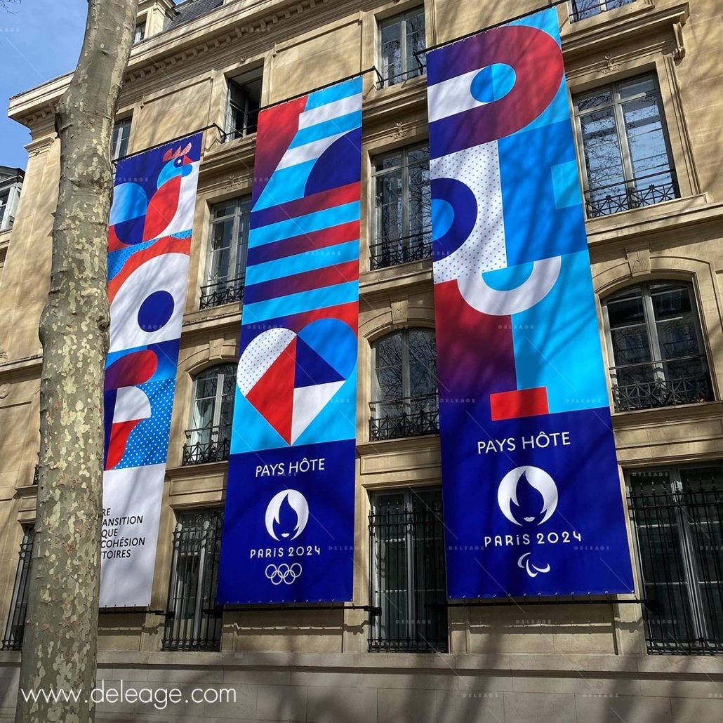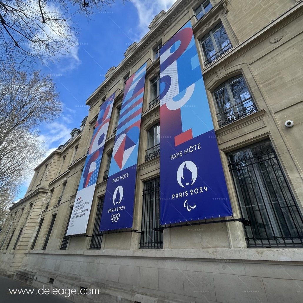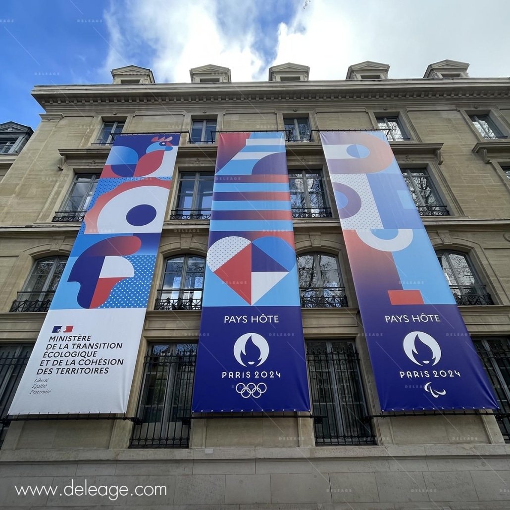Pour mener à bien ce projet, DELEAGE a travaillé en étroite collaboration avec le service du Ministère de la Transition Écologique, en charge de l’organisation de la Tournée des Drapeaux. L’objectif était de transformer la façade du bâtiment en un véritable symbole des Jeux Olympiques, en recouvrant ses murs de façade de 3 bâches monumentales imprimées aux dimensions impressionnantes de 2500mm x Ht 10 000mm.