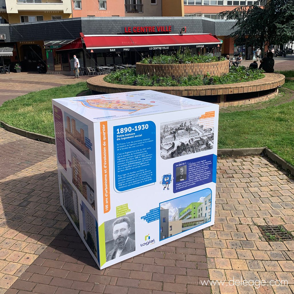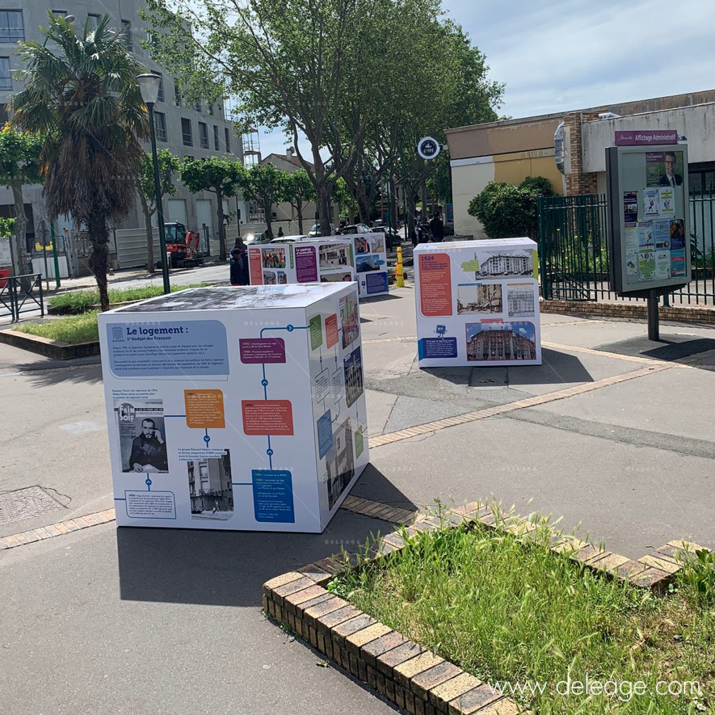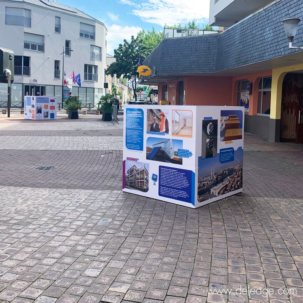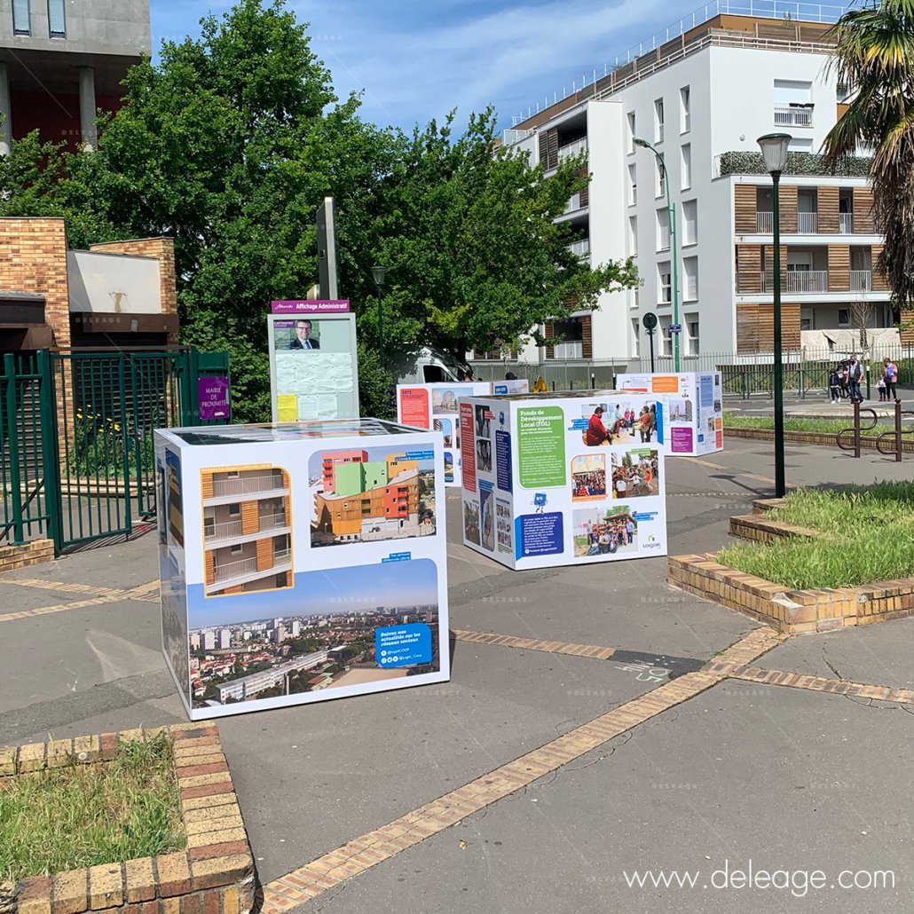 Les cubes ont été habillés de PVC imprimés et ont été dotés d’une plastification anti-graffiti pour assurer leur durabilité et leur résistance.
