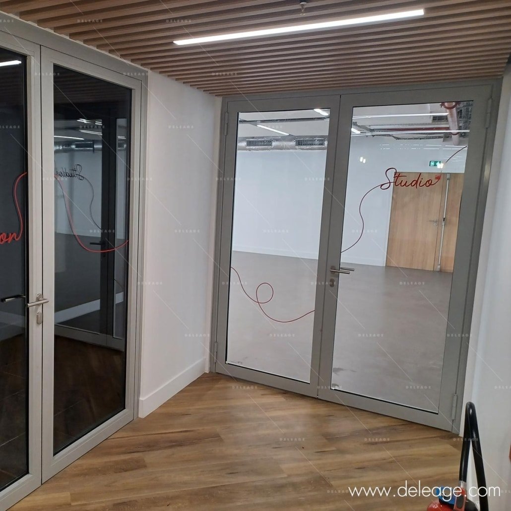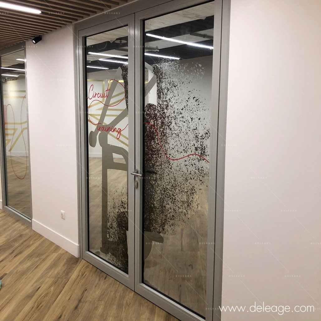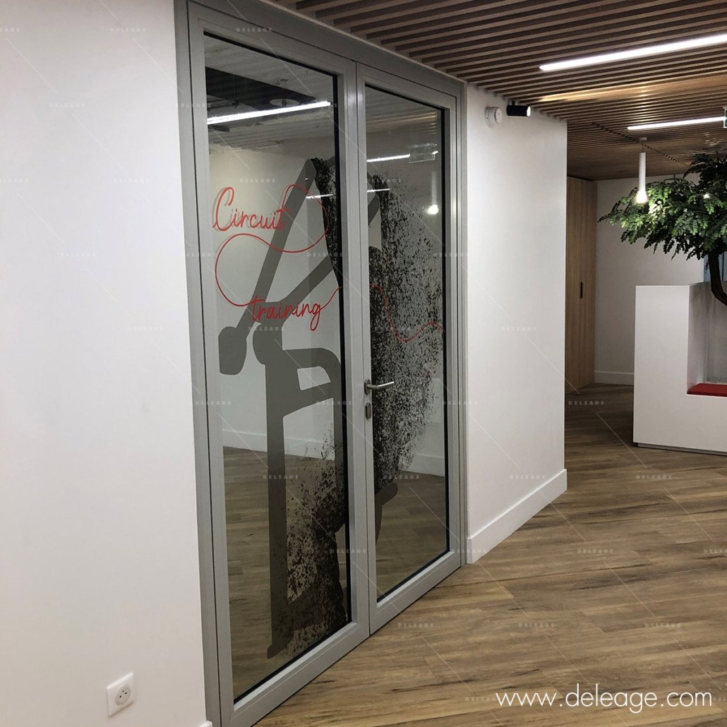 Le traitement des portes vitrées a été réalisé au moyen de vinyle transparent « ultra clear » permettant de conserver toute la transparence et la luminosité au travers d’une impression subtile aux allures de filigranes.