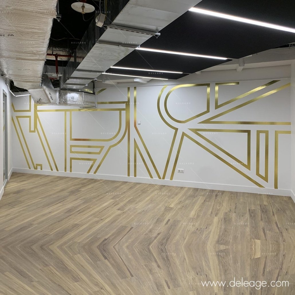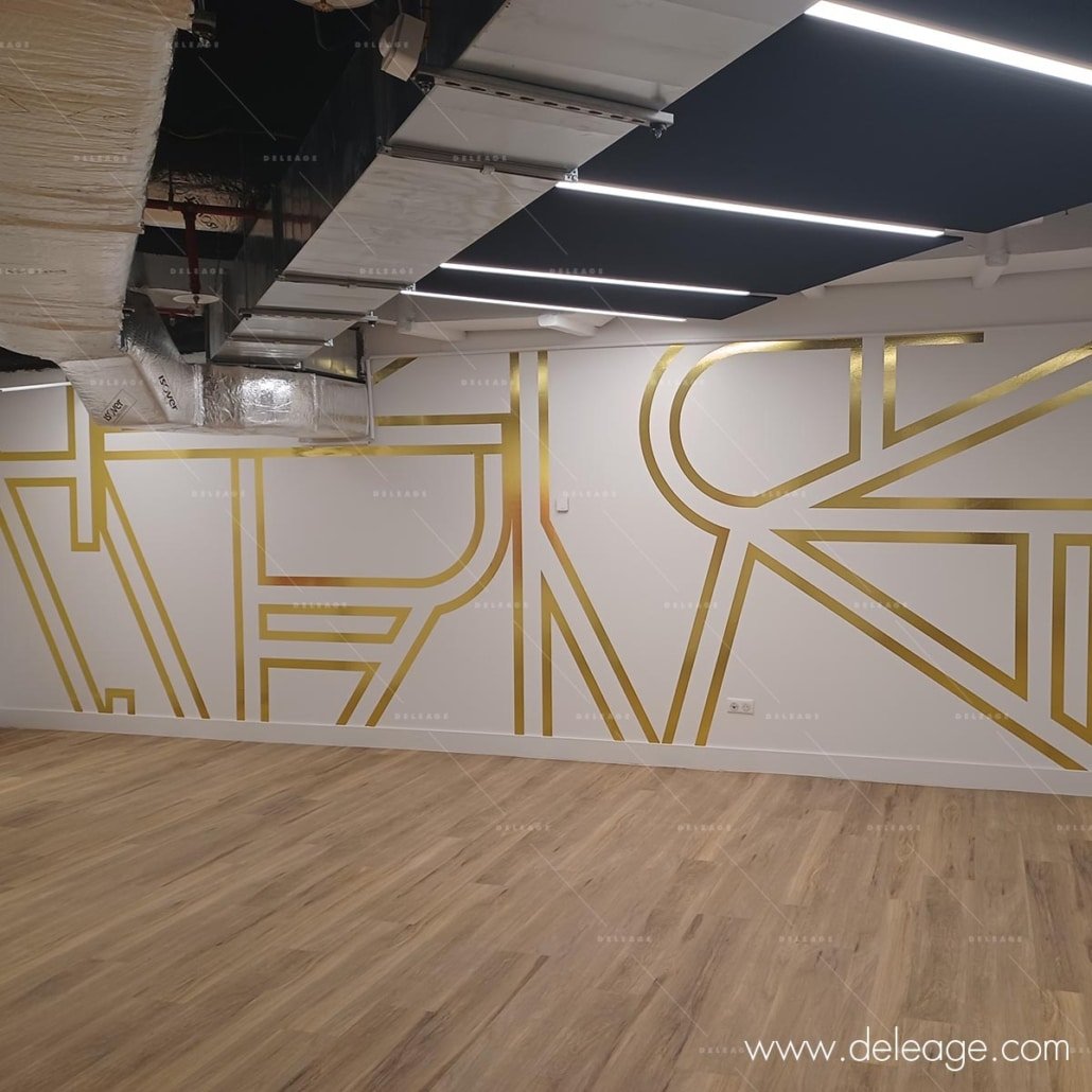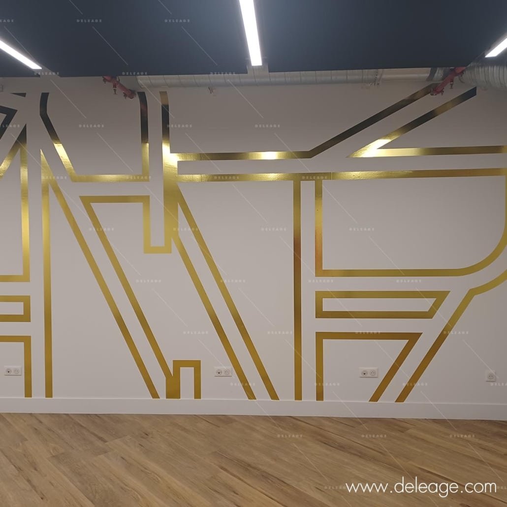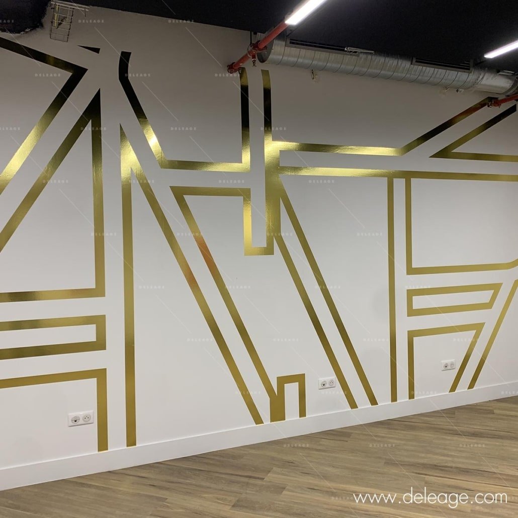Une signalétique décorative ultra tendance riche en or et en couleur. Composée de vitrophanie et de vinyle muraux découpés selon des formes et des courbes à tendance futuriste.