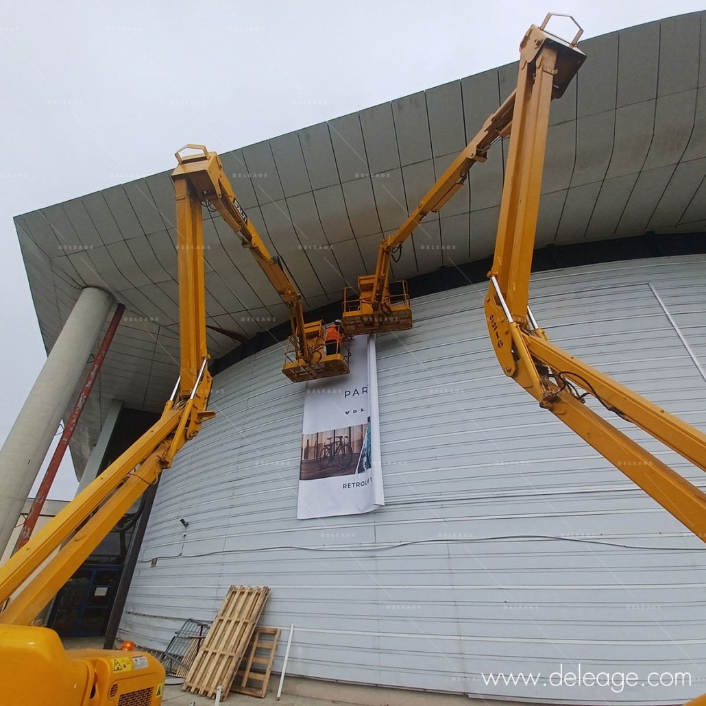Pour réaliser cette prestation, DELEAGE a choisi d’installer un cadre cintrable sur-mesure, permettant de tendre la toile sur sa périphérie. Cette technique assure une tension parfaite sans aucun risque de pli.