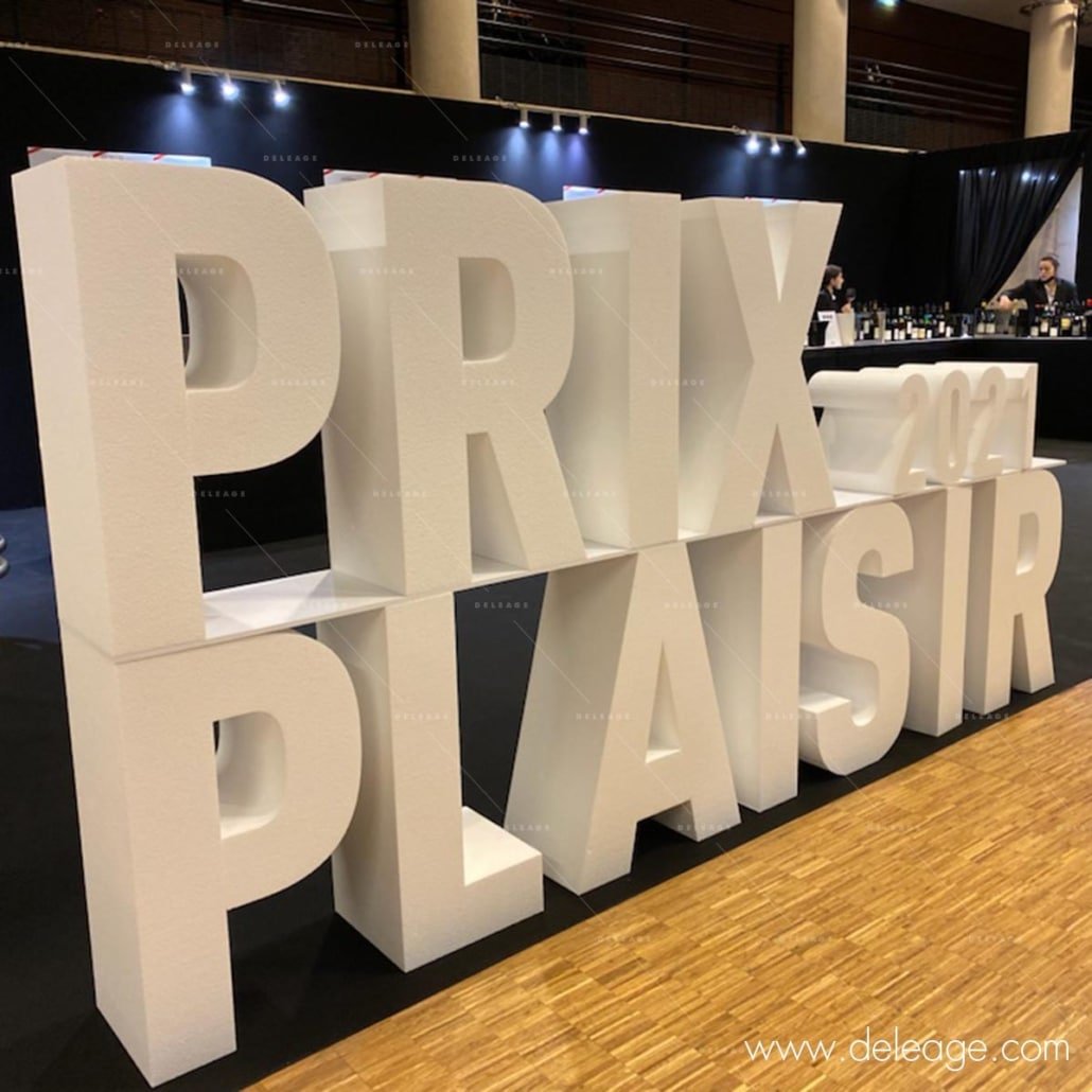 Cette décoration ultra efficace n’aura pas impacté le budget global de l’événement car c’est une technique très économique que propose DELEAGE  en créant des textes et  logos en polystyrène brut sans peinture ni couleur.