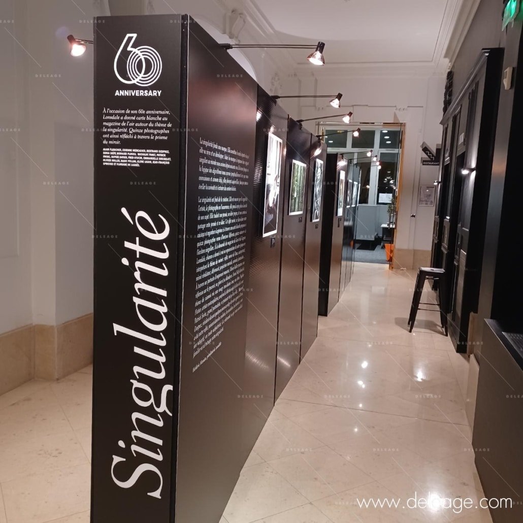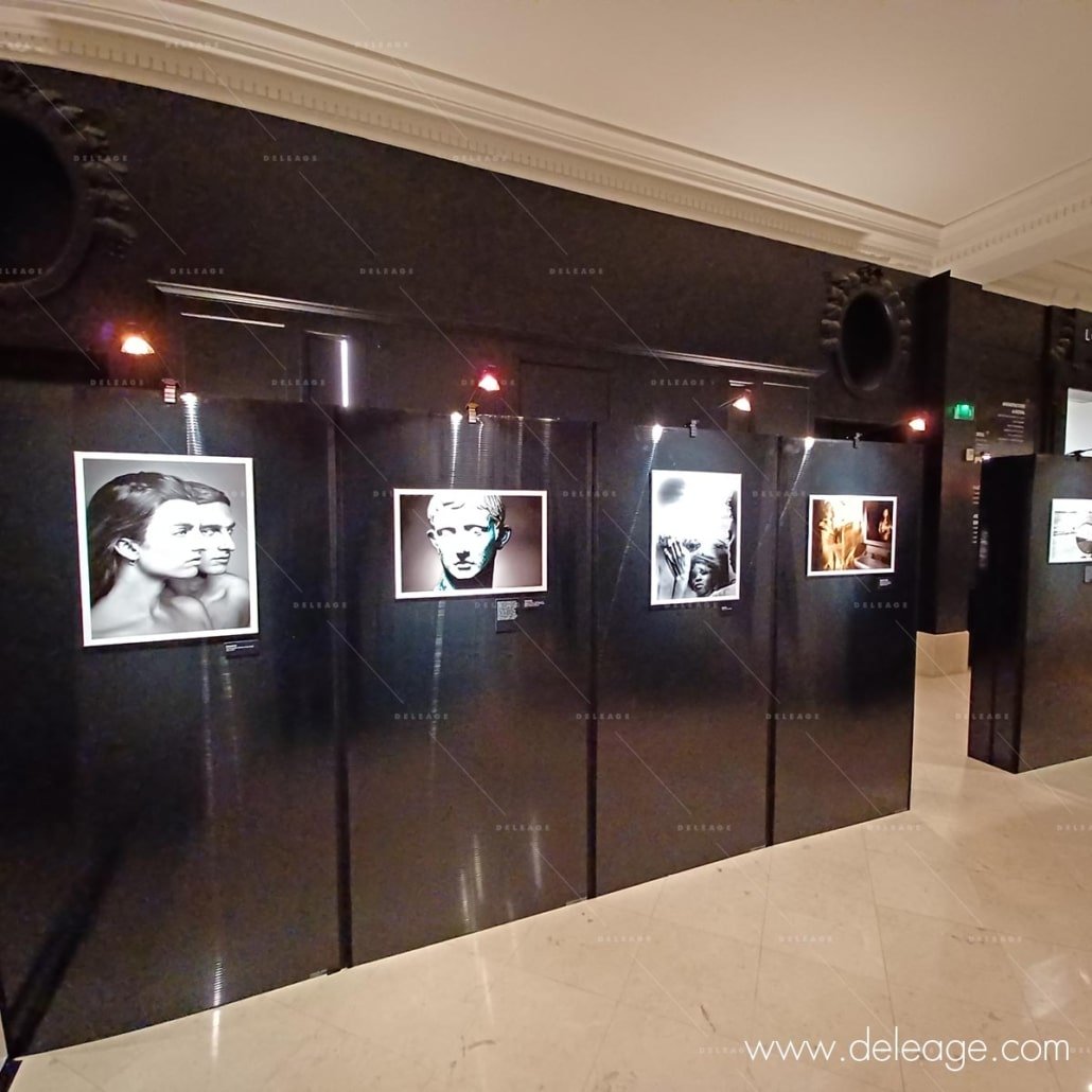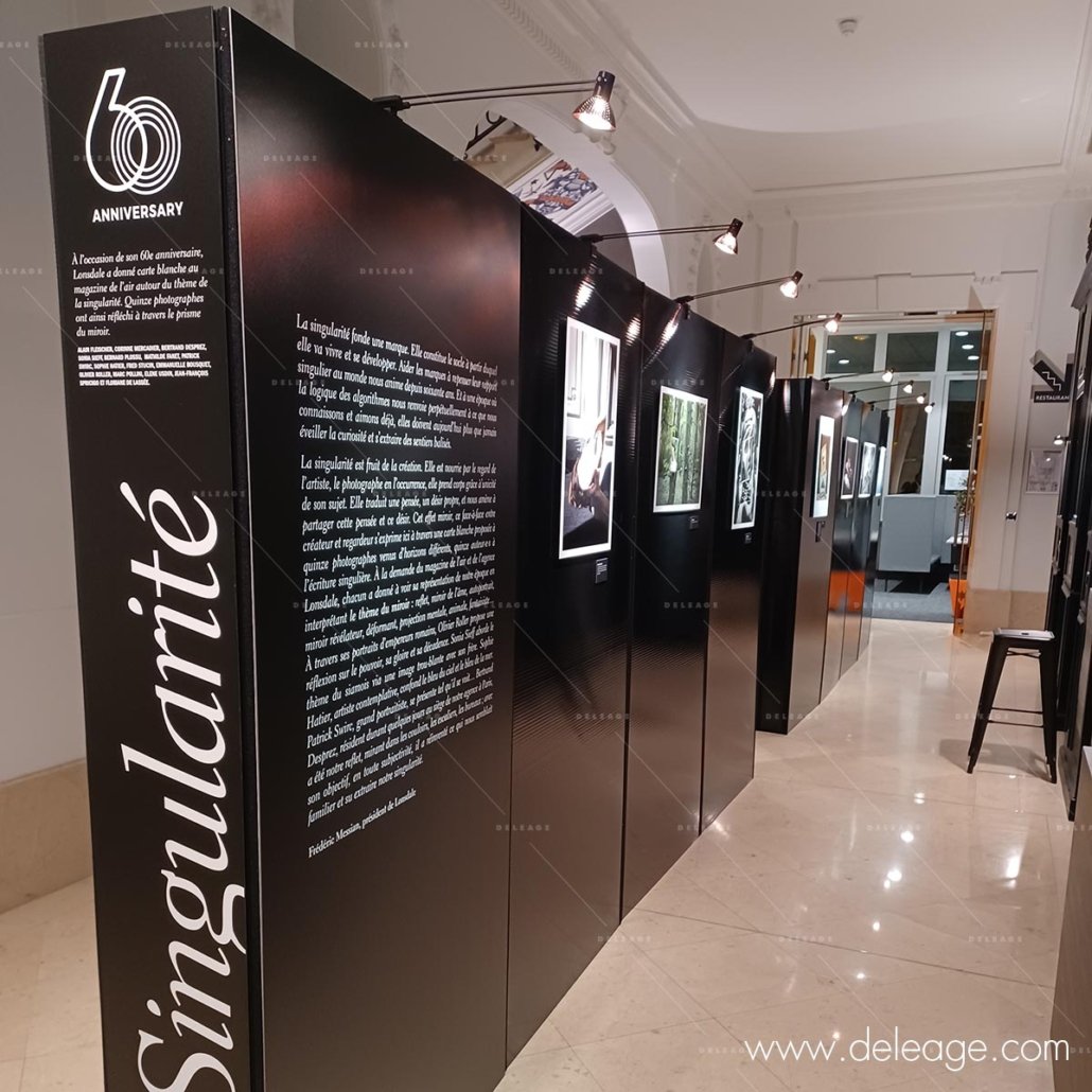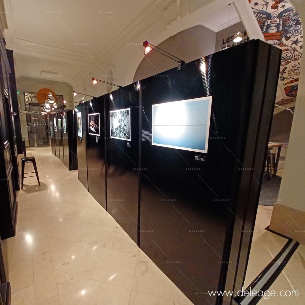 De couleur noir brillant avec un motif d’alvéoles horizontales, ces panneaux d’expo sont particulièrement design. En effet, ils offrent une ambiance muséale tout à fait adaptée au prestige de cet immeuble haussmannien.