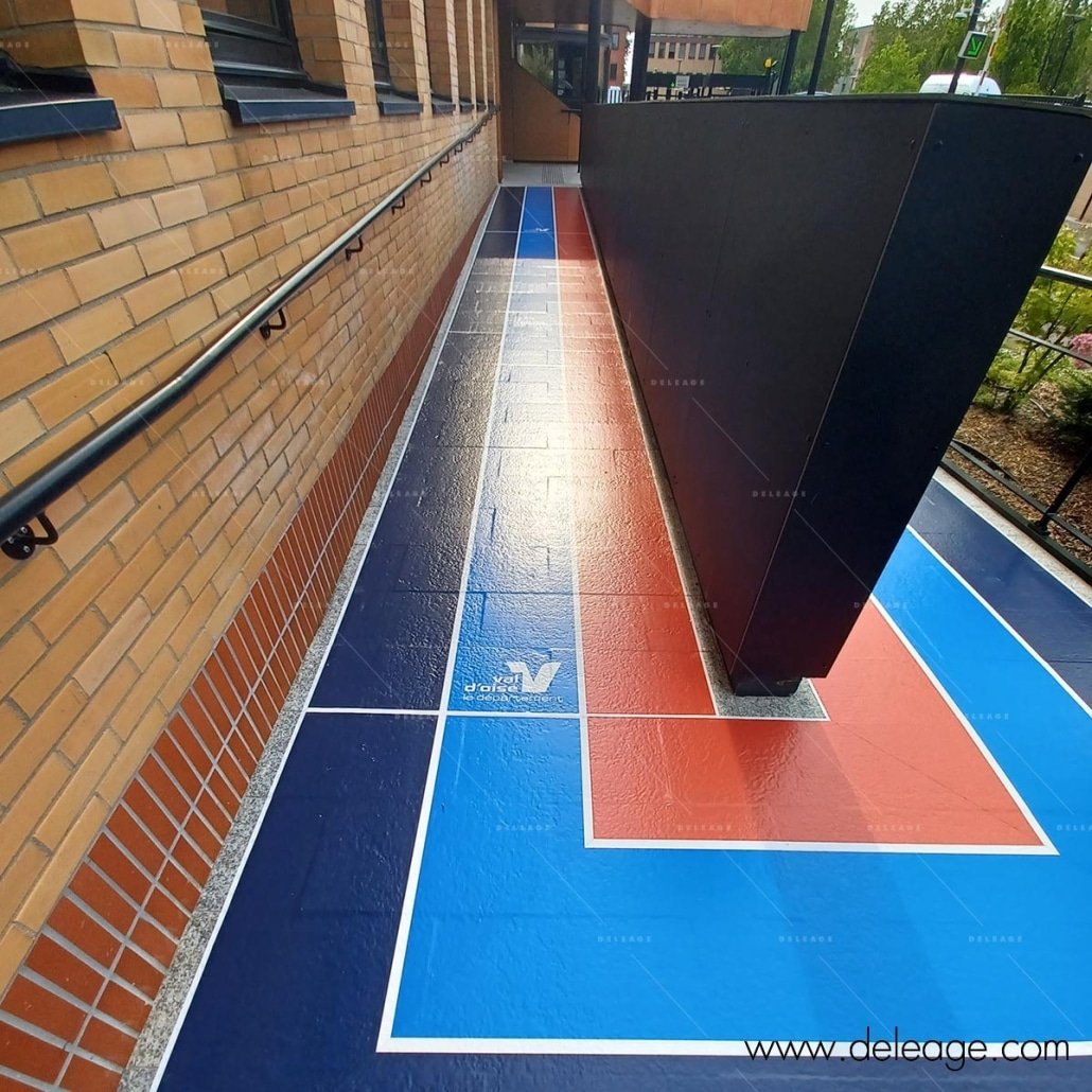 Un autre élément de décoration particulièrement innovant réalisé par DELEAGE est le marquage au sol reproduisant une piste de stade. Ce marquage, fidèle à l’esthétique d’une piste d’athlétisme, permet aux visiteurs de se sentir immergés dans l’ambiance sportive dès leur arrivée. De plus, ce marquage au sol a également une fonction pratique, en structurant les espaces de circulation et en facilitant l’orientation des visiteurs.