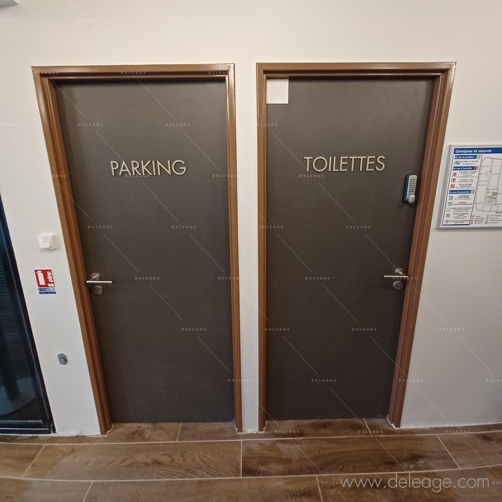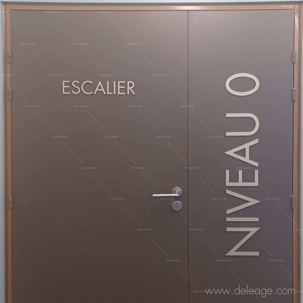 Globalement l’ensemble des marquages sur les portes, pour les paliers et dans les couloirs a été réalisé en lettrages découpés en relief.