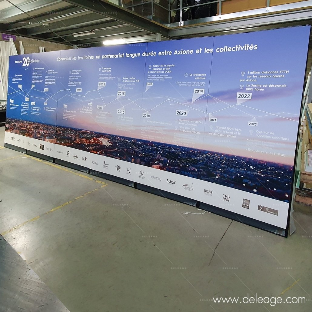 Une time line géante a été reconstituée sur des totems extérieurs assemblés et imprimés avec des PVC amovibles. Cette chronologie visuelle a permis de retracer l’histoire des 20 ans de l’histoire AXIOME, offrant ainsi aux participants une expérience immersive enrichissante.