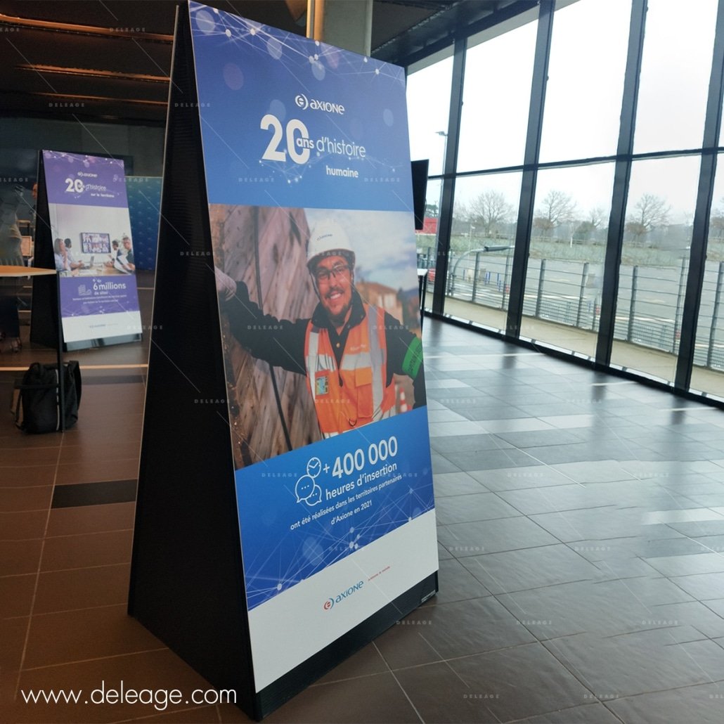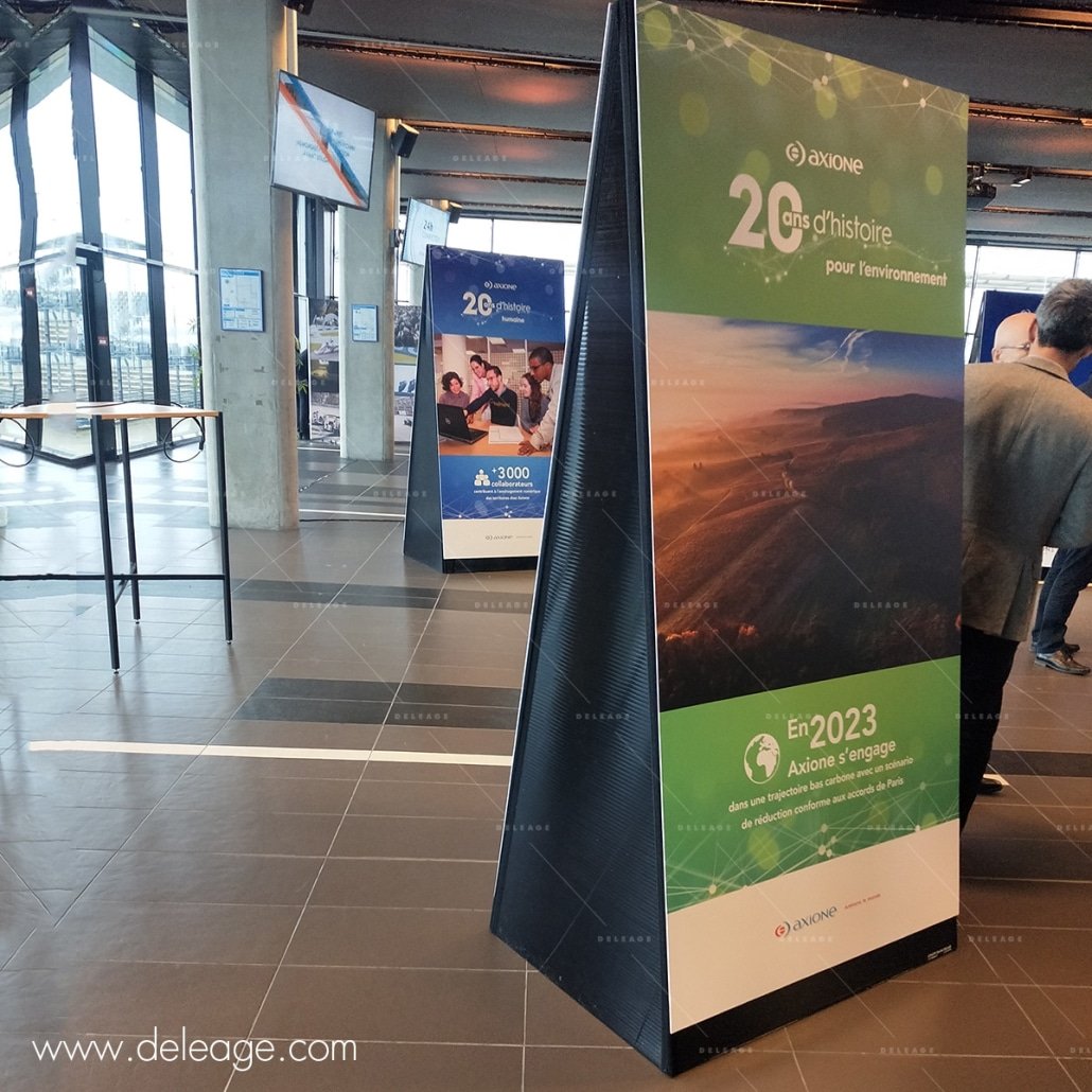 Ces totems ZIG ZAG au modèle déposé par DELEAGE ont été imprimés en recto verso avec des PVC amovibles.