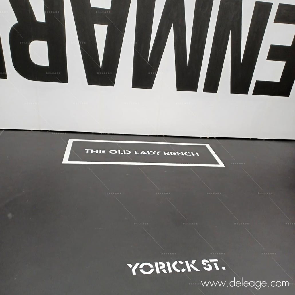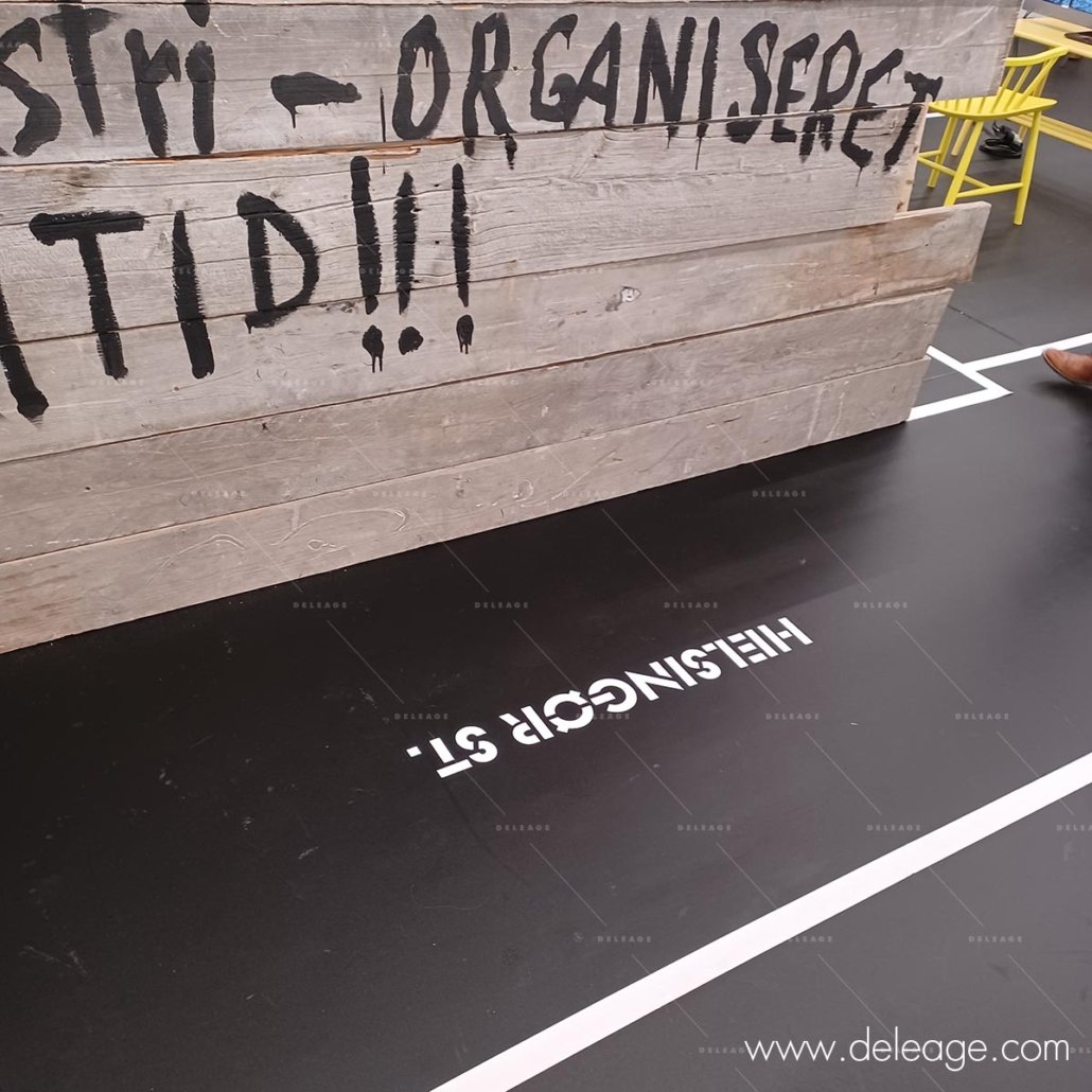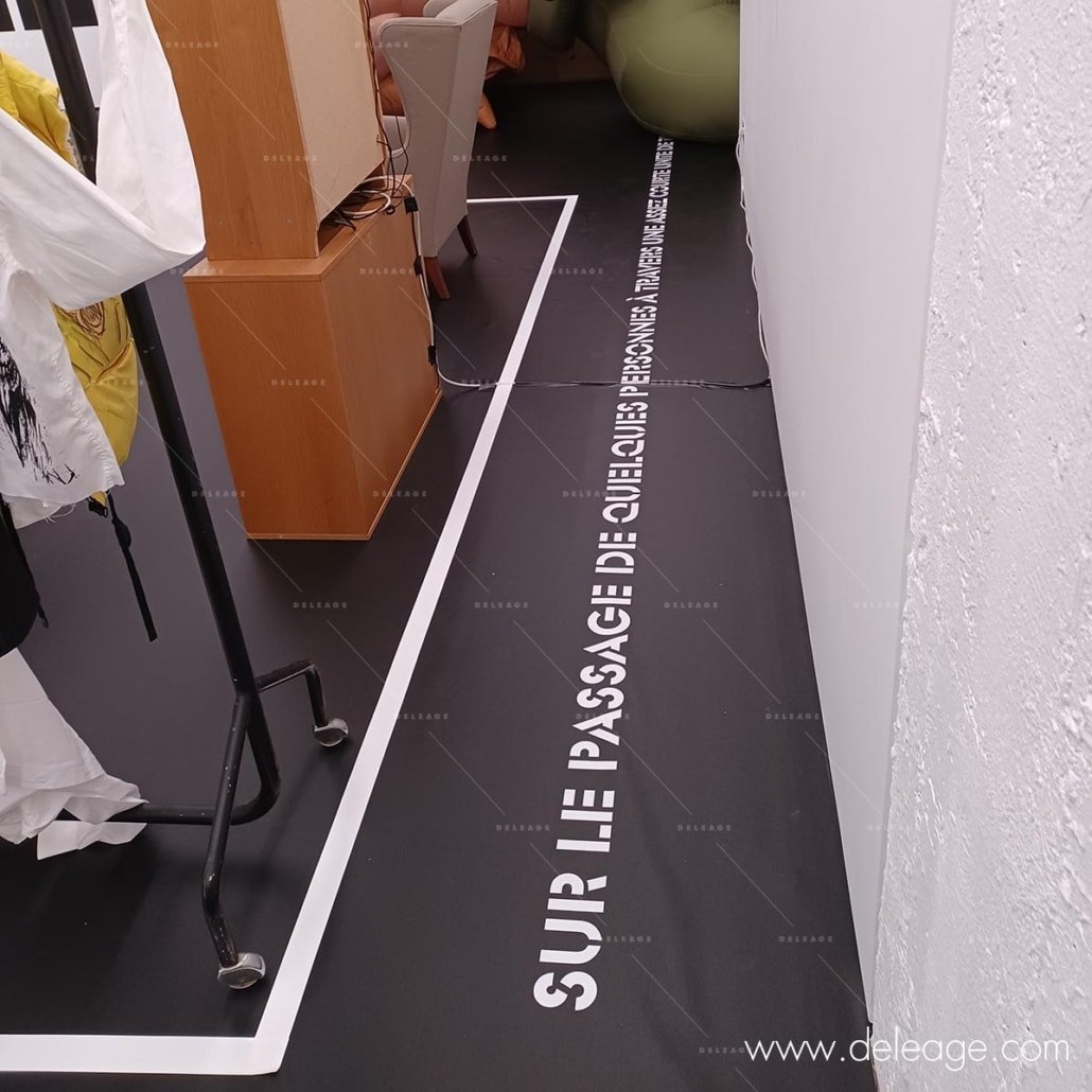 Dans ce cas, c’est le parcours visiteur qui a été dessiné au sol grâce à des lignes et des textes réalisés en vinyle adhésif spécial sol pour cet usage.