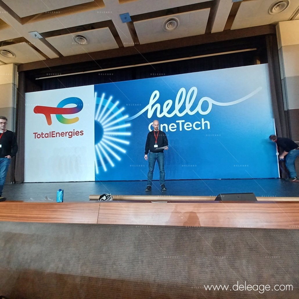 Pour TotalEnergies, DELEAGE a installé un fond de scène structure T3 de 10m x 4m de haut. Ce projet a démontré l’efficacité et la polyvalence du système T3, répondant parfaitement aux besoins spécifiques du client tout en respectant les nouvelles normes environnementales.
