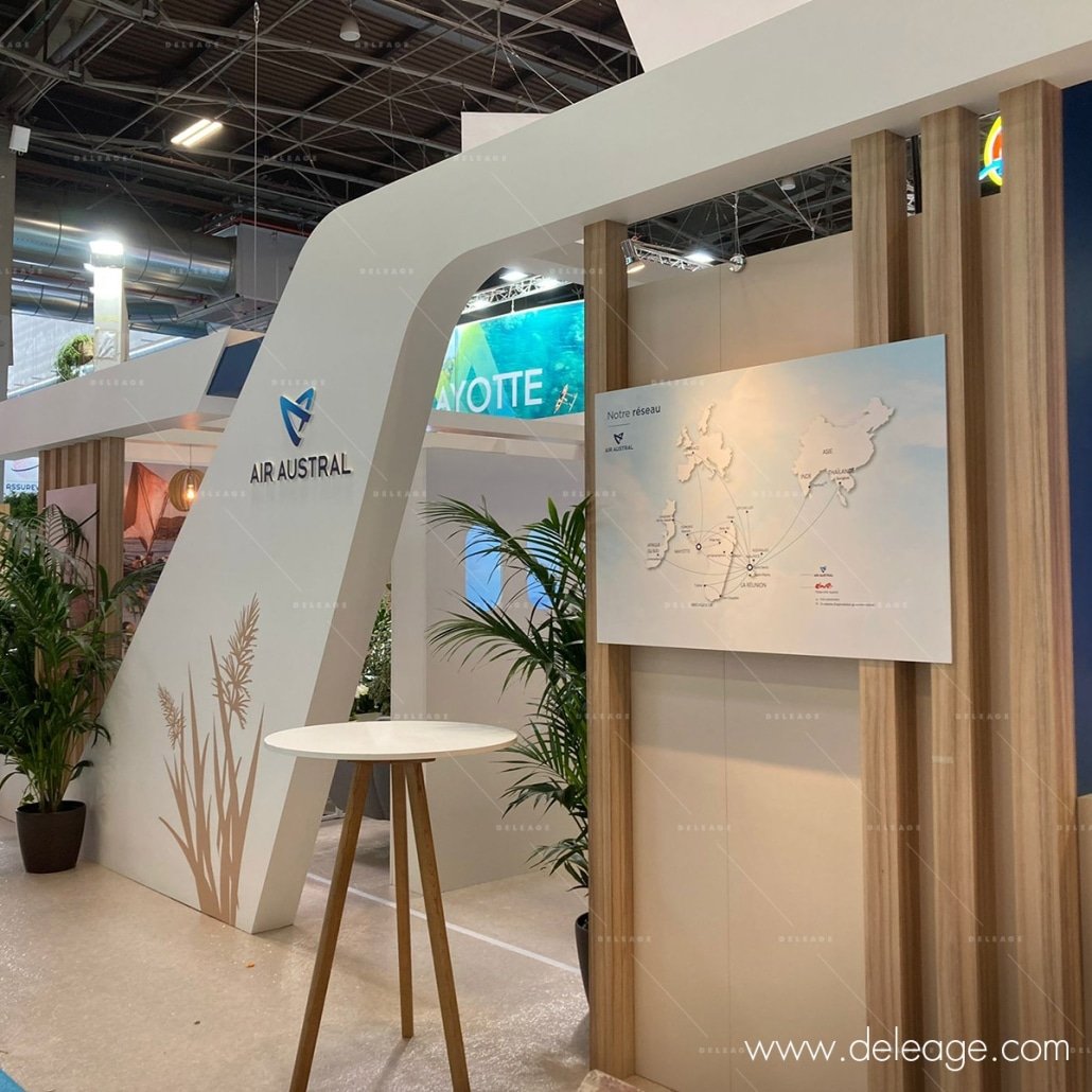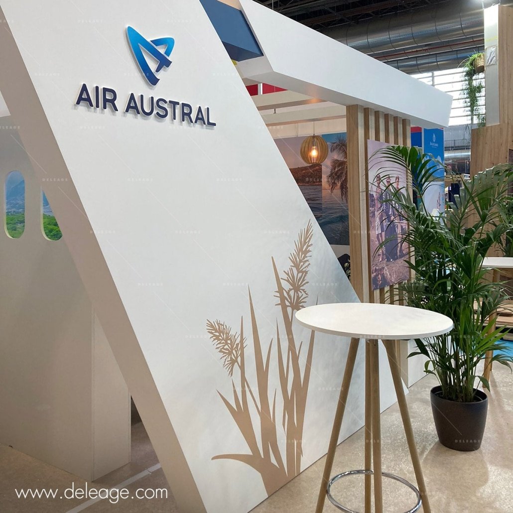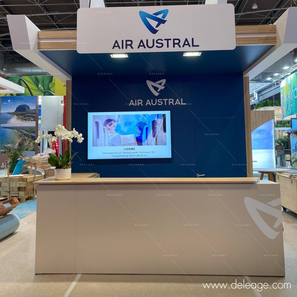 Air Austral est la compagnie aérienne phare dans l’Océan Indien. C’est à l’occasion du salon ITFM 2023 qui réuni les acteurs professionnels du tourisme que la compagnie aérienne a commandé un stand menuisé.