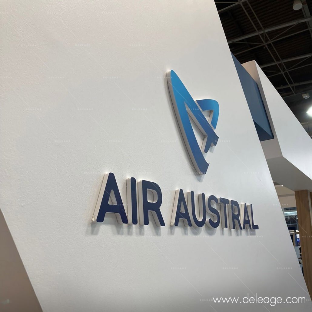 Le logo « AIR AUSTRAL » a été imprimé sur un PVC de 15 mm d’épaisseur puis l’ensemble a été usiné sur une table de fraisage numérique permettant d’obtenir le sigle et les lettres séparées. Ces éléments ont été collés avec précision sur chacune des cloisons au moyen d’un gabarit de pose réalisé avec le même fichier.