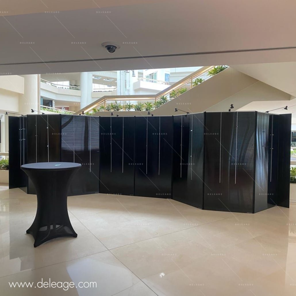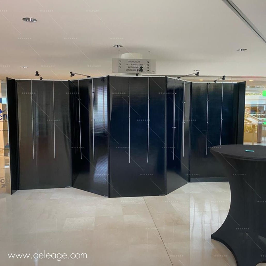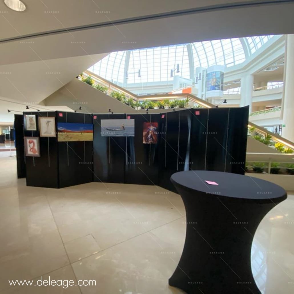 Pour répondre à cette demande spécifique, DELEAGE a opté pour la location de ses célèbres panneaux d’exposition Zig Zag. Ces panneaux, à la fois élégants et modulaires, s’adaptent facilement à l’espace disponible tout en maximisant la visibilité des œuvres exposées. Livré avec deux cimaises et des crochets coulissants, chaque panneau permet de suspendre les tableaux de manière pratique et esthétique. De plus, ils sont conçus pour être utilisés en recto-verso, offrant une polyvalence exceptionnelle sans nécessiter une surface d’exposition excessive.