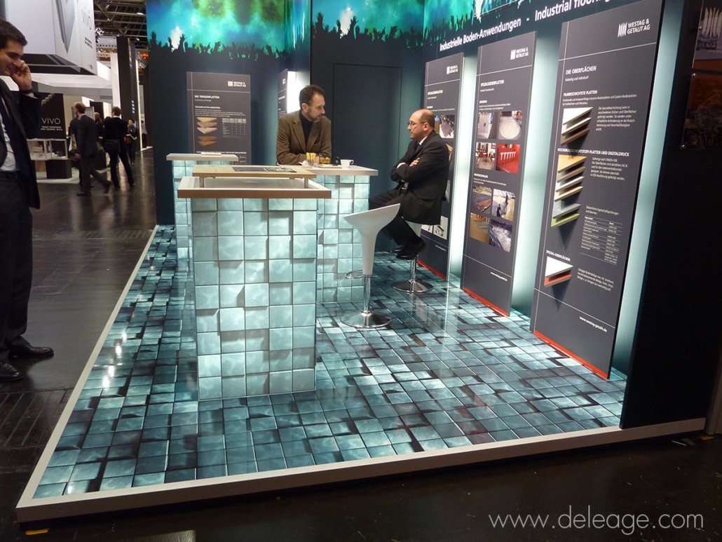 Les sols ont une réelle importance pour un stand d’exposition, il est possible de les habiller avec une moquette simple mais aussi avec une impression numérique totale pour créer un décor immersif en utilisant des effets matières ou des créations graphiques en trompe l’œil.