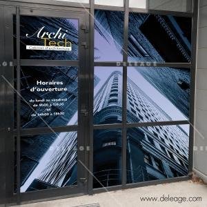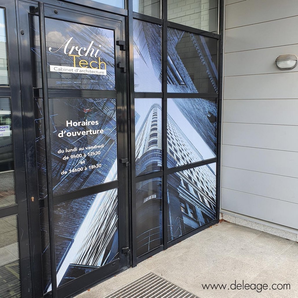 La face vue de l’extérieur est une impression en quadri et l’autre face est noire ajourée de milliers de perforations ce qui permet de rendre le vinyle totalement invisible et permet de voir à travers la vitre.