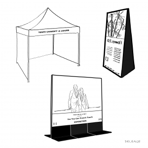 Chez DELEAGE vous pourrez louer des tentes pliables de type 3X3, des embases pour panneaux ou des totems extérieurs (pyramide ZIG ZAG)
