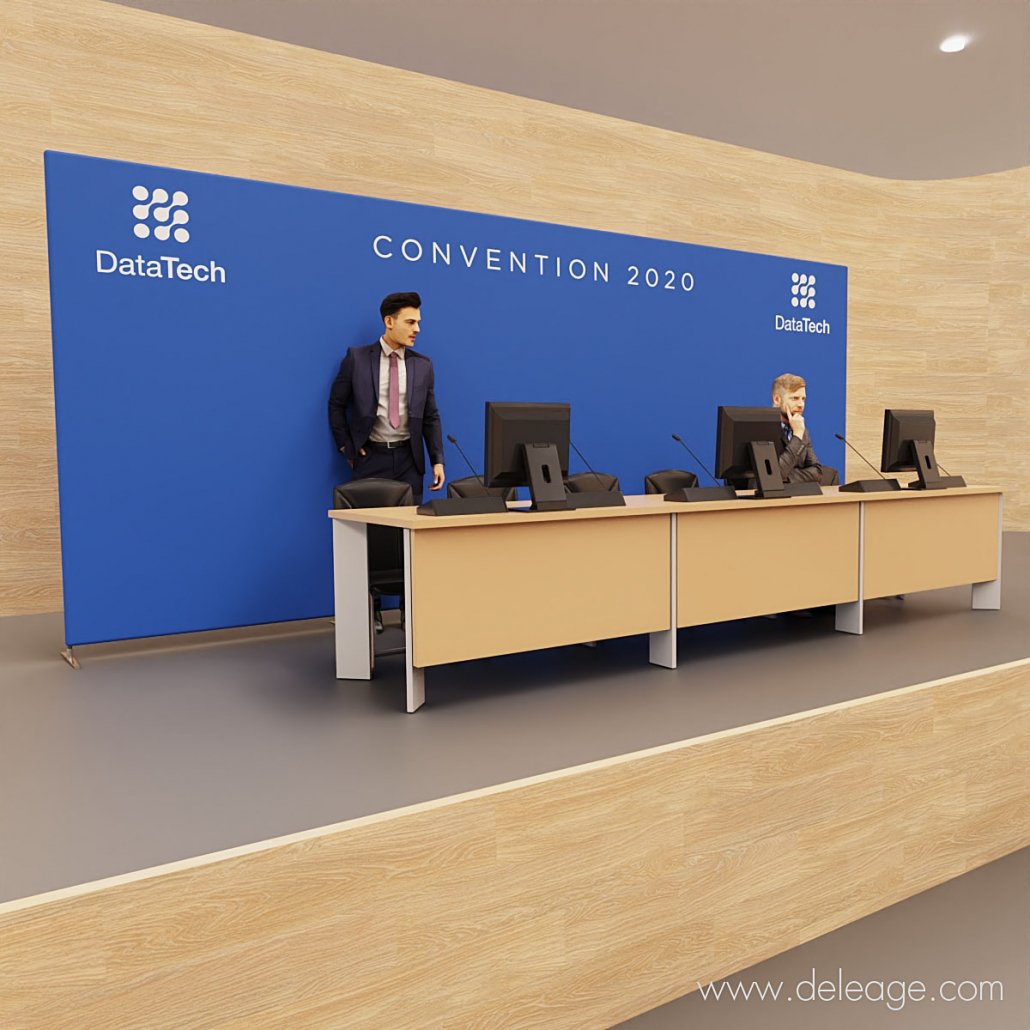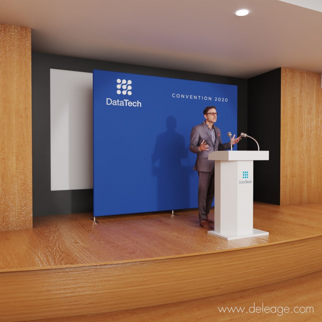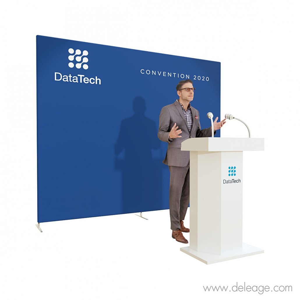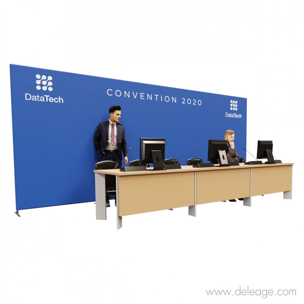 Ce modèle de fond de scène en tissu tendu est conçu pour pouvoir être transporté en avion ou en voiture et pour